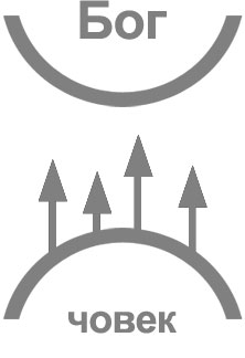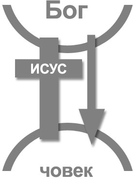 Има разстояние, празнина между нас и Бог. Стрелките показват нашите усилия да достигнем Бог, като правим добро на другите, чрез религиозни ритуали, като се опитваме да бъдем добри хора и т.н. Но проблемът е, че нито едно от тези усилия действително не покрива, нито премахва греха ни.